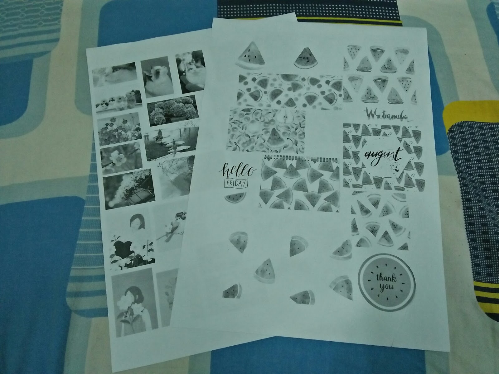 Mình in chữ August và dán lên nhé, không phải mình viết đâu. Hai miếng dưa hấu kia cũng là in nhé. Ngoài ra, mình cũng vẽ thêm một số lát dưa để đỡ trống.