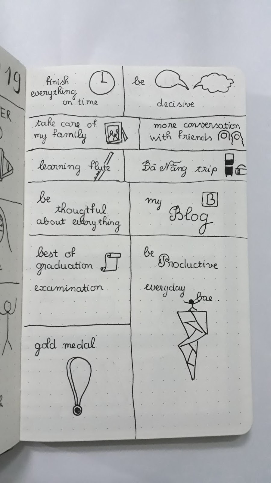 Khác biệt chút xíu là năm nay mình vẽ hình minh họa cho các mục tiêu nữa. Vì trong năm 2019 mình muốn trở nên sáng tạo hơn nên mình quyết định sẽ vẽ nhiều lên để rèn luyện khả năng sáng tạo.